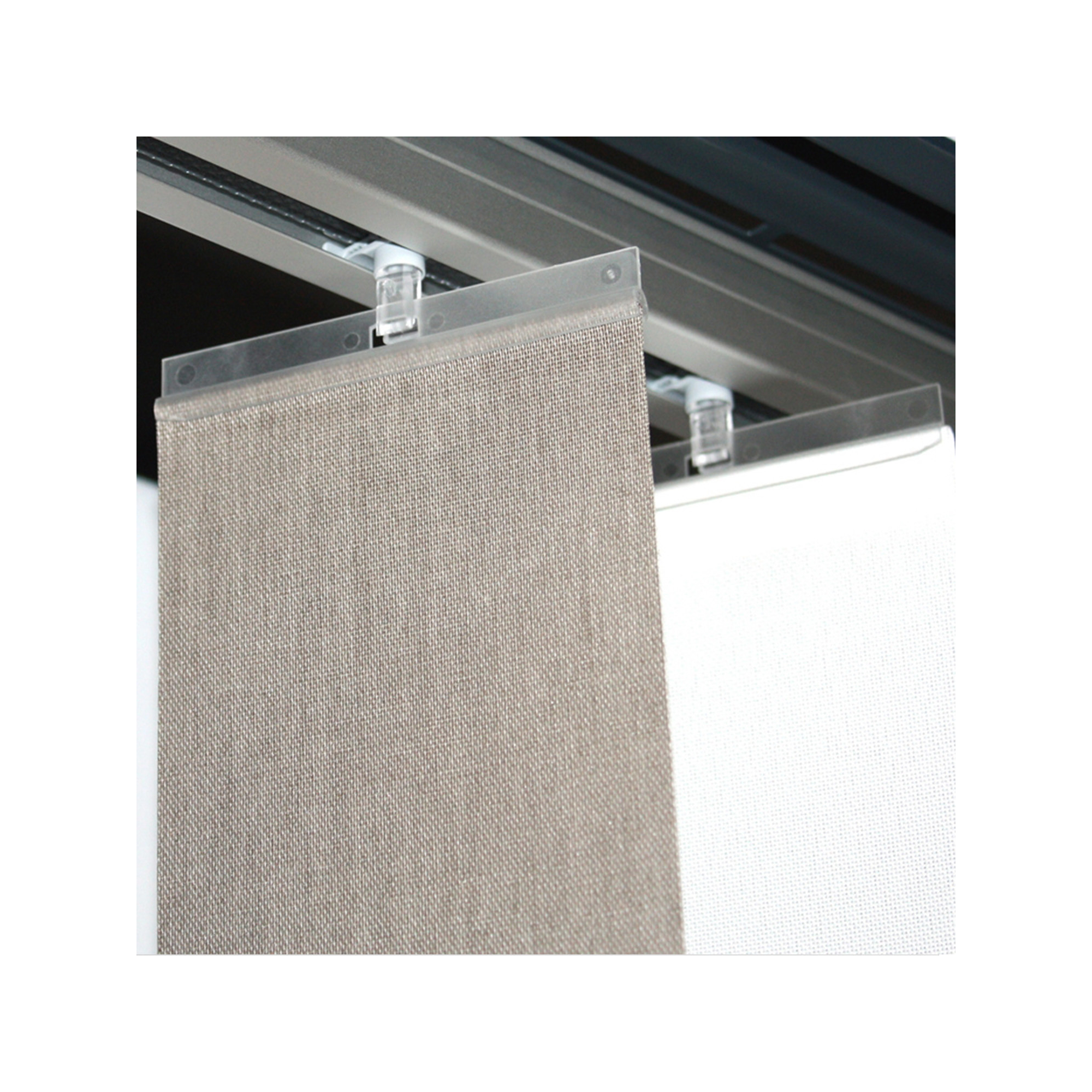 Jeu de 5 barrettes hautes transparentes pour fixer un store à lamelles verticales de 89mm sur les chariots coulissants du rail.