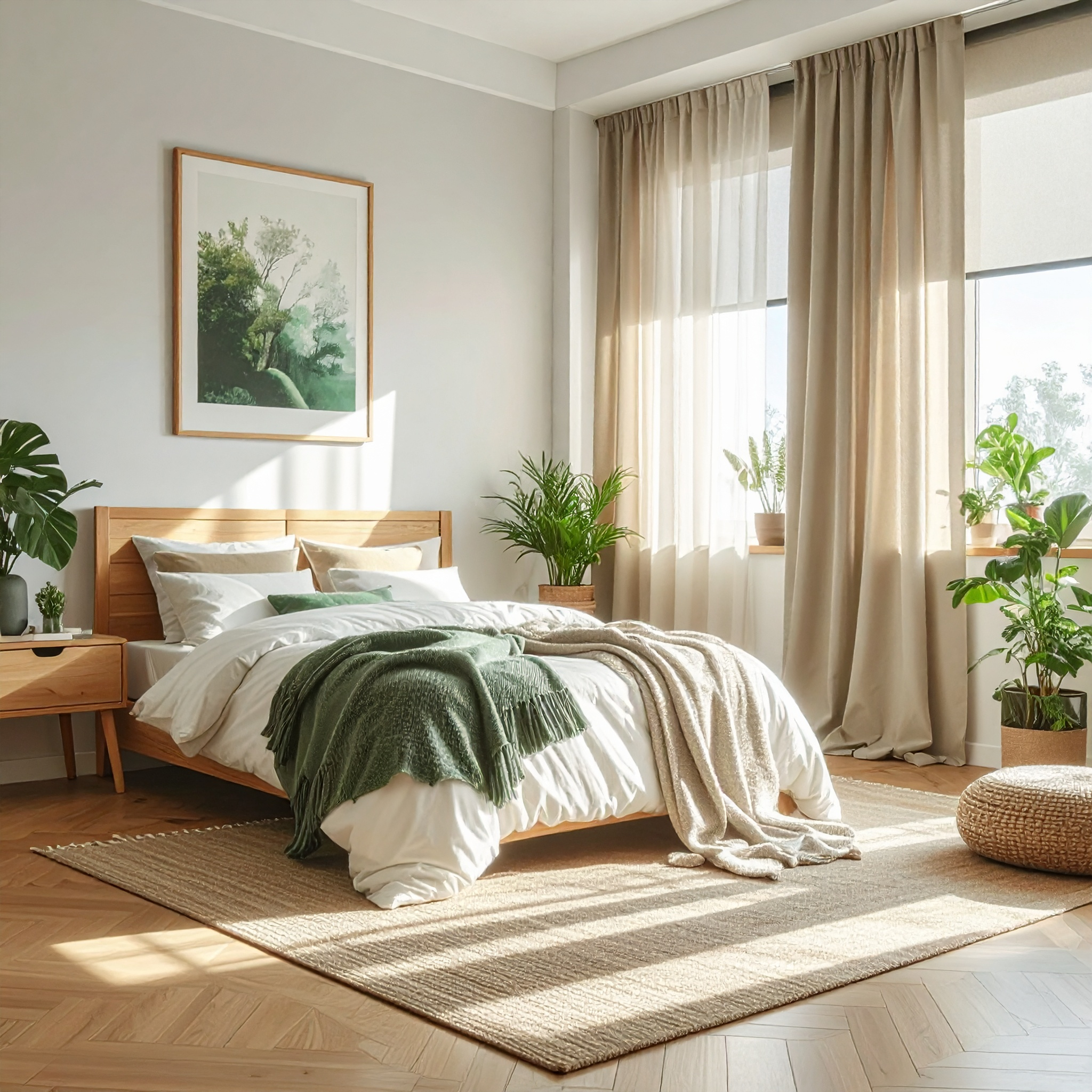 • Style scandinave : un store enrouleur blanc + un voilage beige clair.