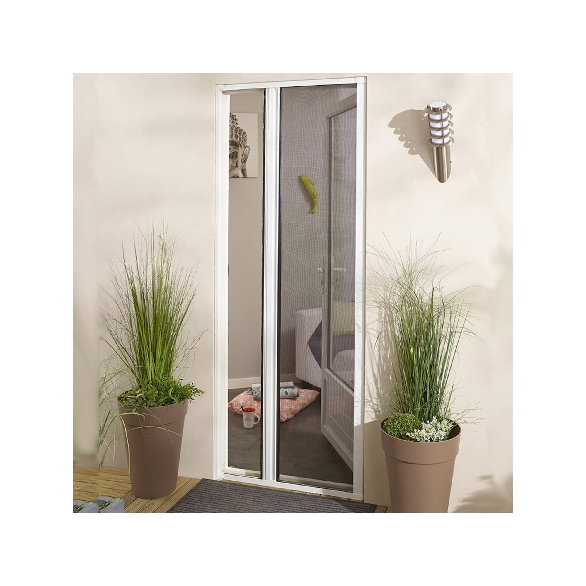 La moustiquaire latérale pour porte et fenêtre de la marque Protecta s'ajuste à la façon d'un store enrouleur traditionnel, mais de façon verticale. Son mécanisme à ressort est simple, fiable et robuste. Vous pouvez décider de poser la toile à droite ou à gauche selon votre besoin.