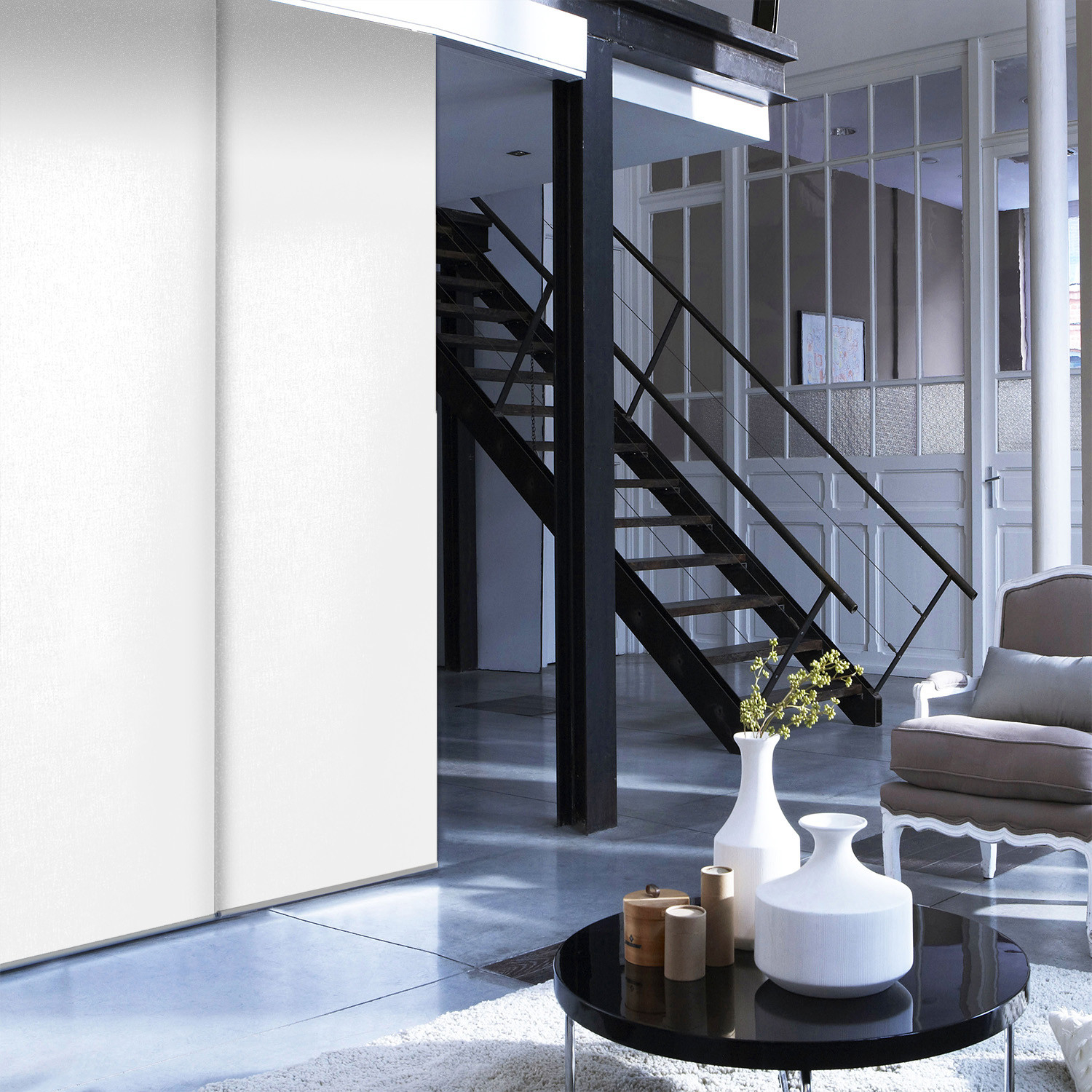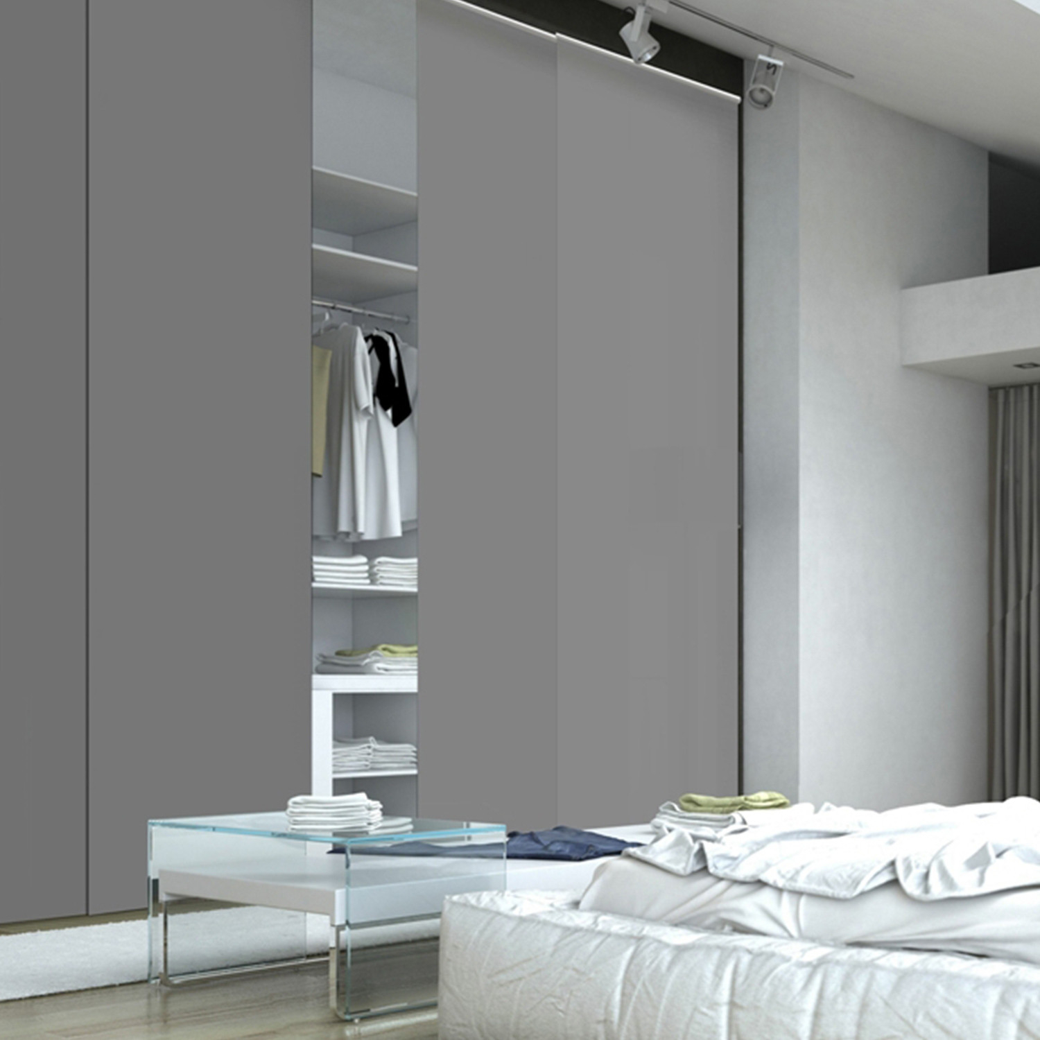 Panneau en tissu avec bande auto agrippante. Solution idéale pour habiller une baie vitrée, séparer un pièce ou cloisonner un placard.