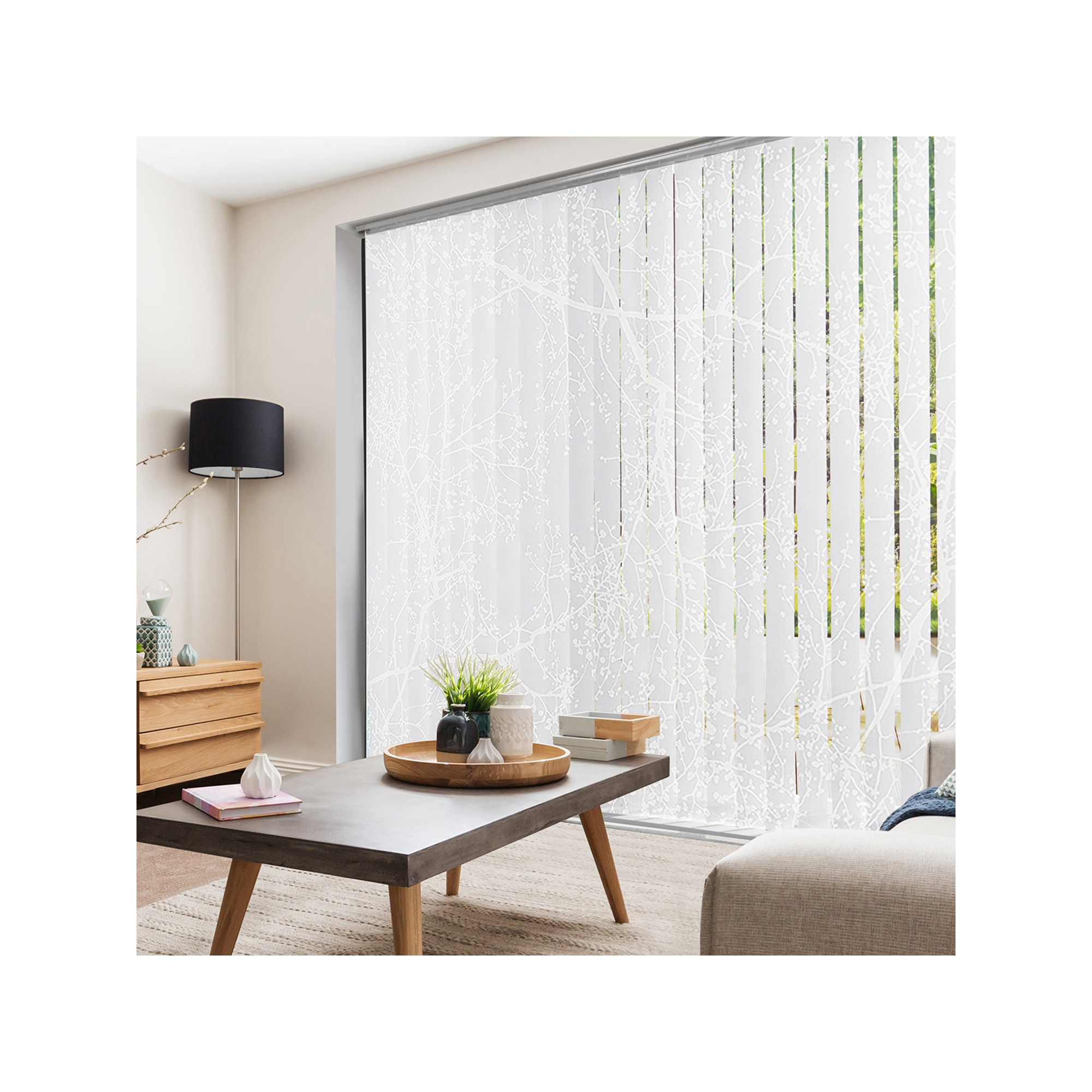Habillez vos fenêtres élégamment avec le lot de 5 lamelles verticales 89mm tamisantes motif arbre pour store californien.
