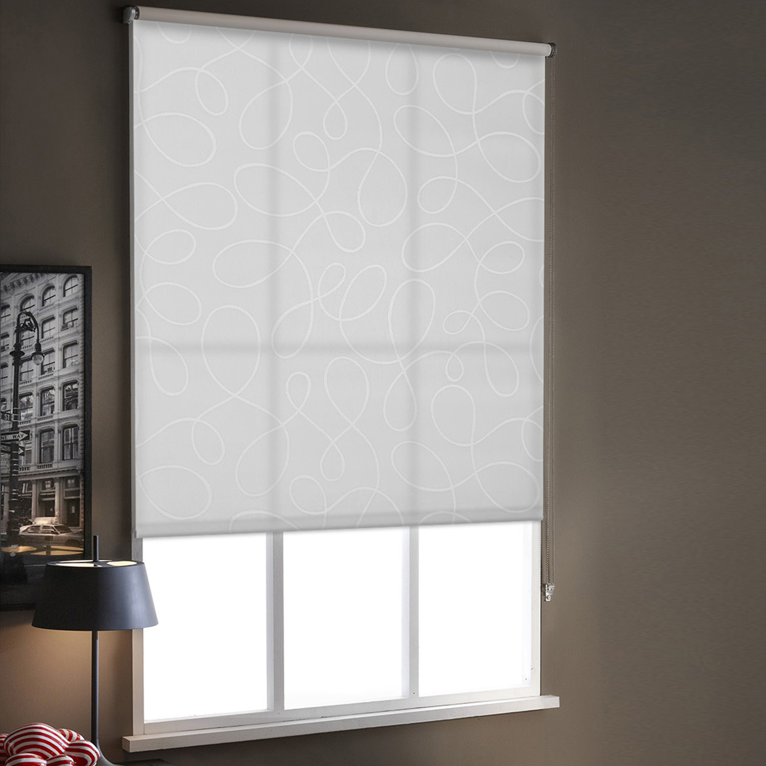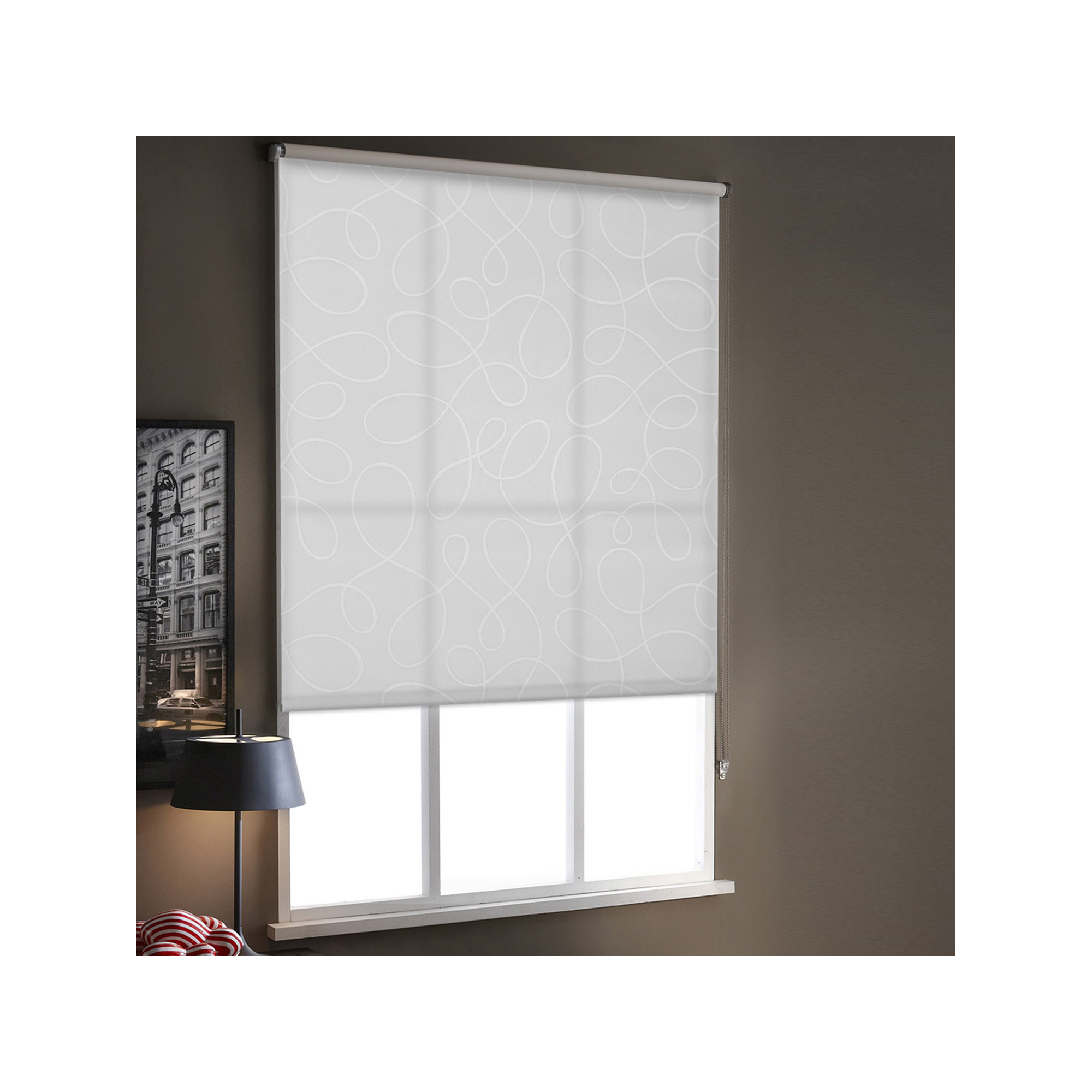 Le store enrouleur tamisant motif méli mélo laisse entrer la lumière en douceur tout en vous protégeant du vis-à-vis. Idéal dans les pièces de vie et bureaux.