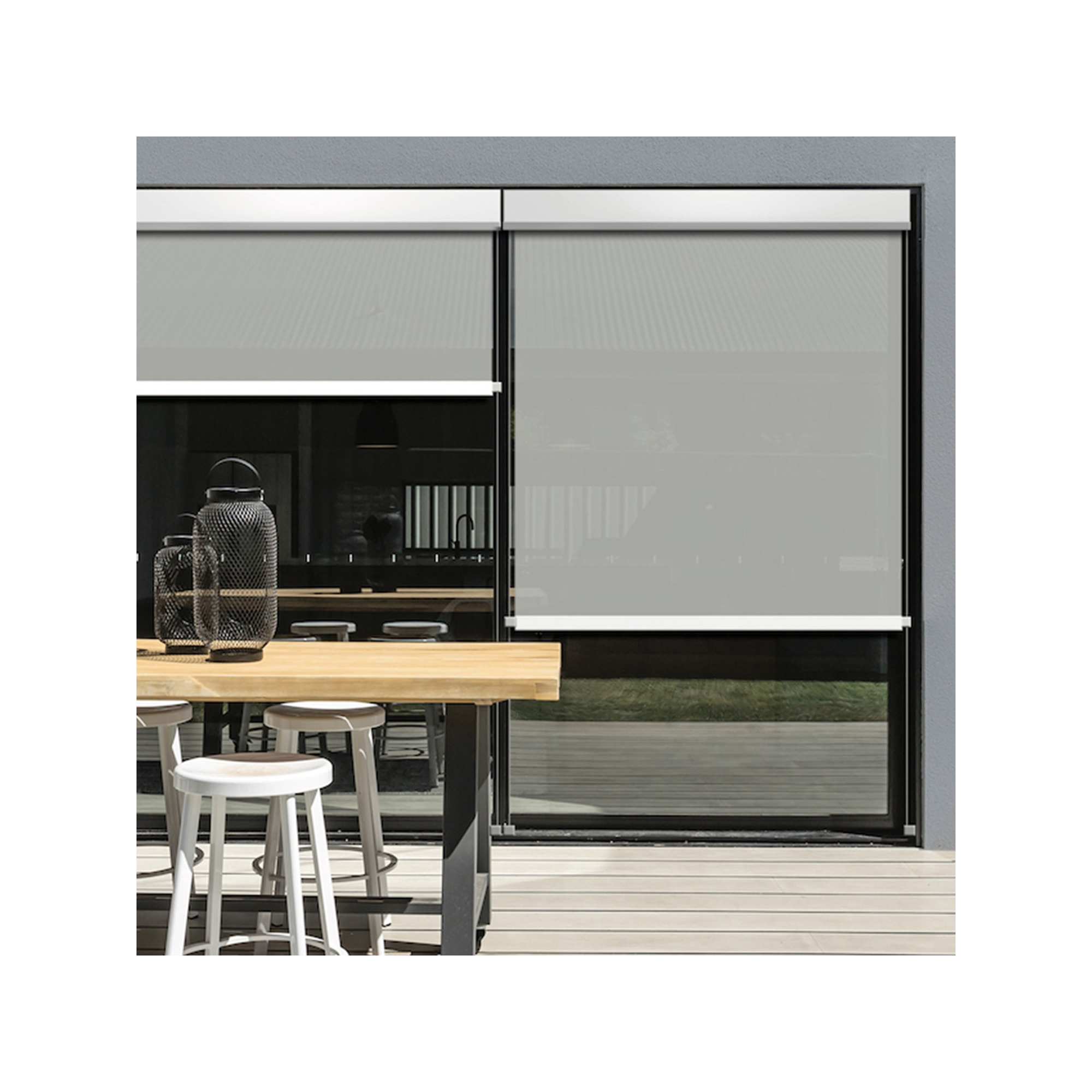 Découvrez le store enrouleur extérieur motorisé avec sa toile en tissu screen, parfait pour l'extérieur. Store avec moteur filaire, manœuvre par inverseur.